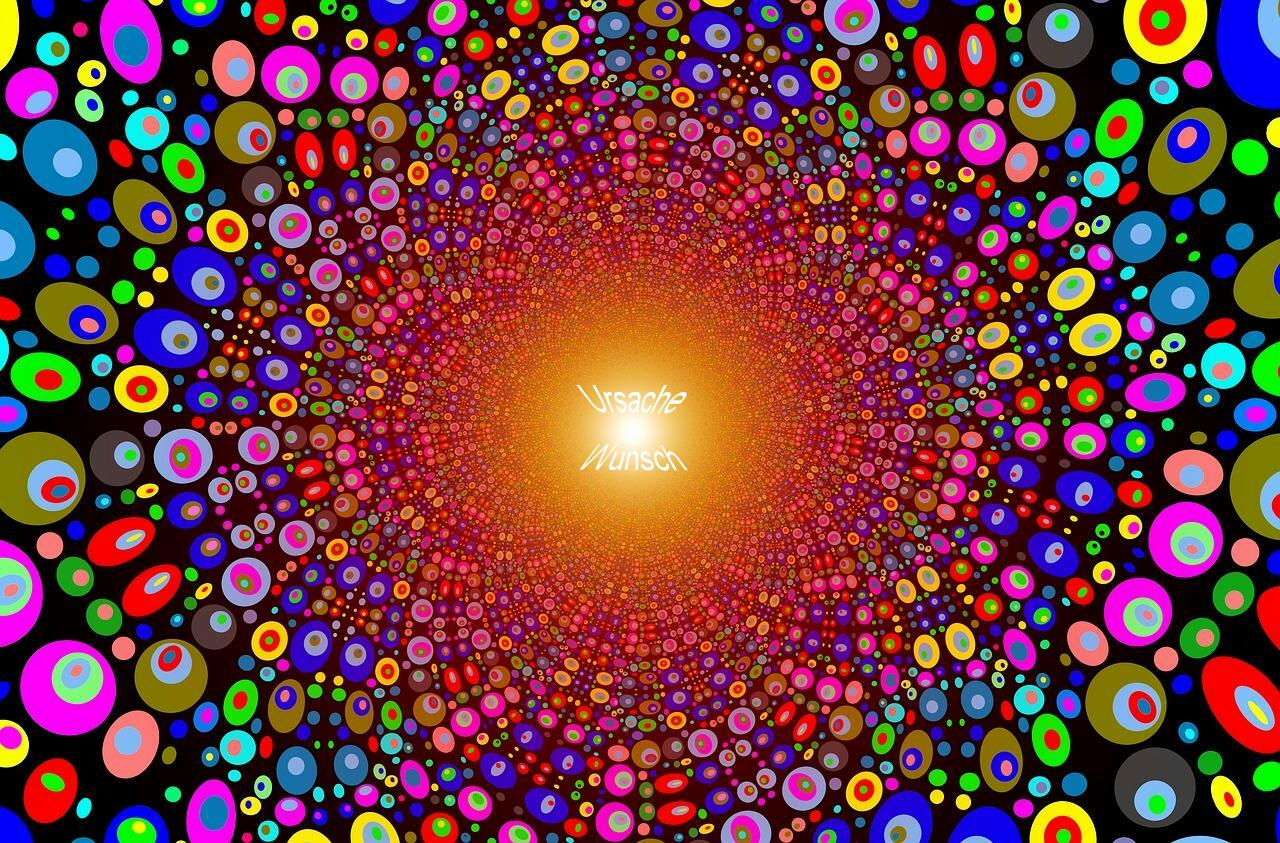 Dieses "Herbei-Wünschen" war aber nicht nur die Ursache am Anfang, sondern findet bis heute ununterbrochen statt. Vielleicht befindest du dich gerade in einem Raum. Schau dich um. Alles was du siehst, war einmal luftig-leichter Gedanke und Wunsch, bevor es sich so angeordnet hat.